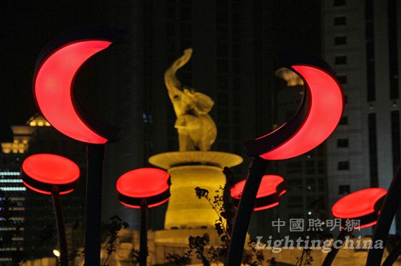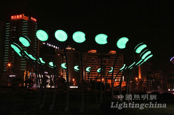 月牙灯,24根LED月牙形灯具组成一套完整的月牙,演绎了月亮从新月、上弦月、满月到下弦月的全部过程,华灯初上,月牙不断变幻的色彩,加之灯具本身的不同形态,给南宁市民带来了一场光影视觉盛宴。