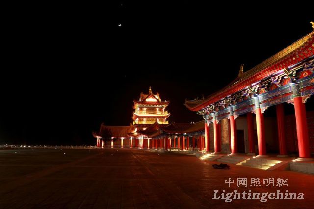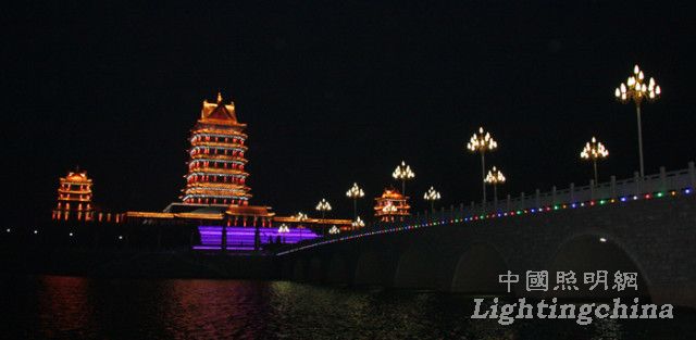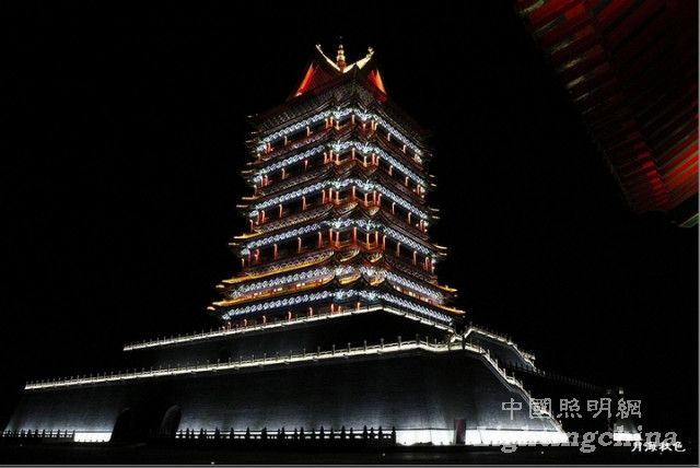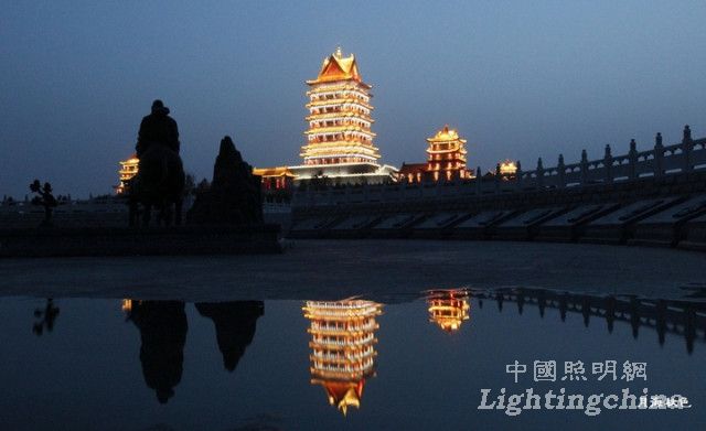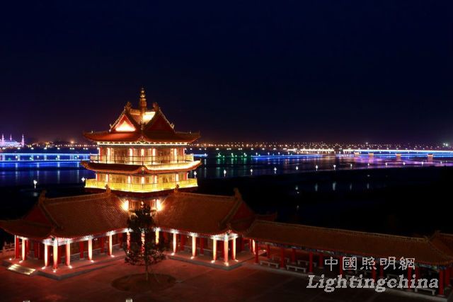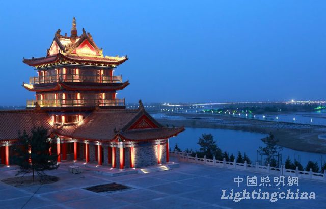 中华黄河楼的夜景照明主要通过对光与影相生相合的特性的合理把握。在夜晚营造出杜甫诗句中所描写的曲江池“菖蒲翻叶柳交枝,暗上莲舟鸟不知。更到无花最深处,玉楼金殿最参差。”的独特景致。在具体的设计上,采用了绿化、水岸照明为映衬,主要景点建筑照明点睛的手法。分级别,分层次运用灯光。使整个景区在夜间呈现出气势恢宏,浓淡有致灯光效果。