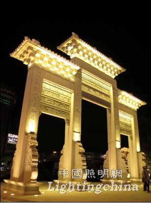 该区域整体景观定位为古朴、优雅,历史牌坊在灯光的晕染下形成一种非凡的古典美,静谧中体现了一种厚重的历史美感。