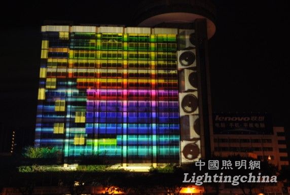 采用8台当今最高端的32000流明输出的室外投影机,结合3d投影技术,将富华酒店立面投射出动感十足的立体影像,影像紧密结合建筑结构,给人一种强有力的视觉冲击。