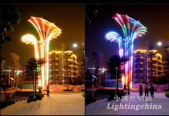 九个火树银花灯柱屹立于水岸广场河畔,每个灯光雕塑分别由19根不同规则的弯曲立柱组成,LED绚丽的线条灯清晰地勾勒出花体的结构,雕塑在灯光的映衬下绚丽多姿,灯光从底部缓缓亮起,犹如一朵朵小榄菊花绽放于岐江水岸。