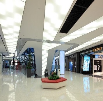 室内设计的思路和目标都很清楚:希望创造一个明亮,干净,年轻时尚,高雅的购物环境。像老牌的一些商业那种昏暗或者充满温暖的购物中心情调决不是这里要考虑的。在来福士的商业中,灯带是主要的照明方式。因此,灯带的均匀性是设计师一开始就强调的,设计师为此给客户提供了详细的节点和尺寸要求,以保证灯带的最后效果。但最后从现场测回来的实际灯带安装尺寸只有150mm的高度,少于300mm的设计要求,意味着所有的灯管会像排骨一样,从张拉膜后面露出来。好在经过精心试验,找到了一种与外立面感觉相仿的图案。很多去过来福士的人都说,来福士比较明亮干净,实际上,这与选择光源也有很大的关系。设计师没有使用国产的荧光灯光源,而是选择了54W的OSRAM进口荧光灯,因为它的色温(4000K)更适合商业照明。