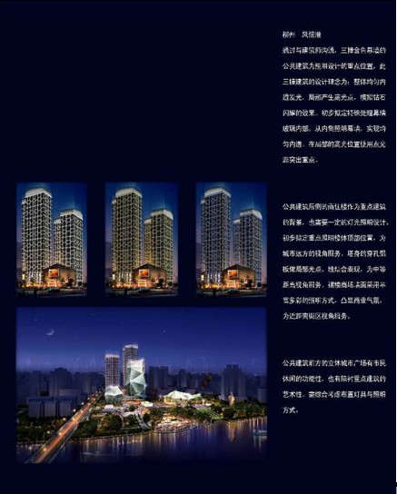 公共建筑后侧的商住楼作为重点建筑的背景,也需要一定的灯光照明设计,初步拟定重点照明楼体顶部位置,为城市远方的视角服务。塔身的穿孔铝板做局部光点、线综合表现,为中等距离视角服务,裙楼商场墙面采用丰富多彩的照明方式,凸显商业气氛,为近距离街区视角服务。