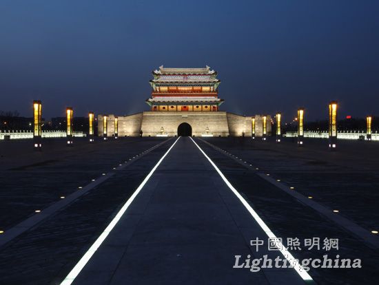 永定门城楼及南中轴广场夜景照明,以北京城市建造历史作为设计的背景,以景观设计方案为骨架,摘取与永定门密切相关的要素为基础,以尊重城市,尊重建筑的态度,来对其进行意象还原的照明设计。